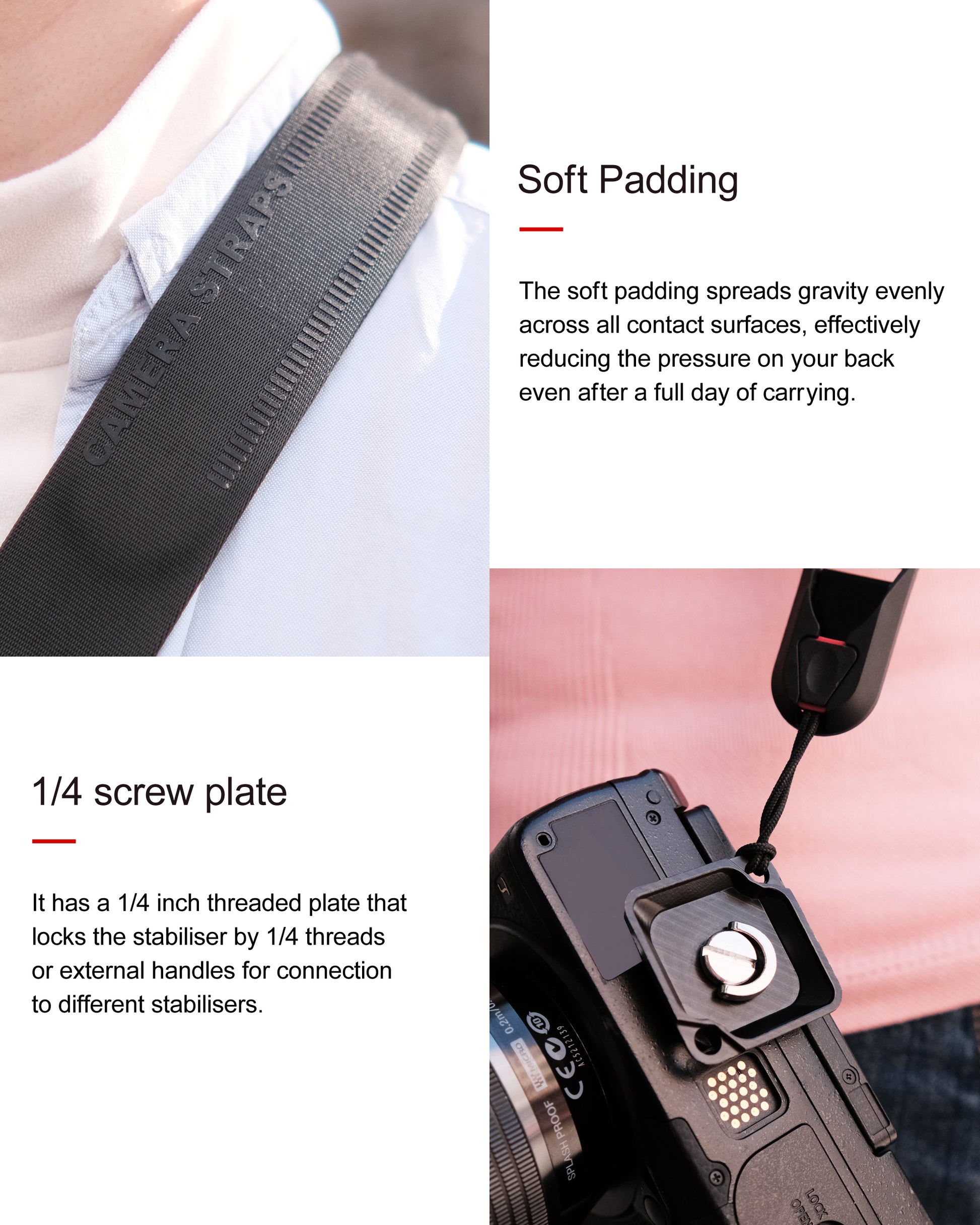 "Sling -style carry shifts the camera's weight down for a stable and easy carry."